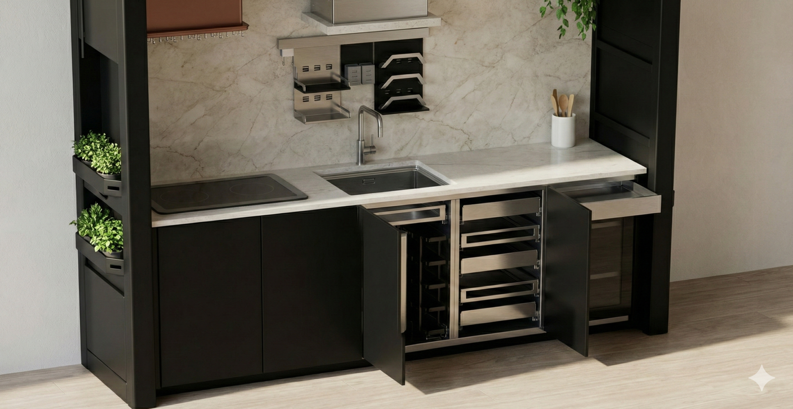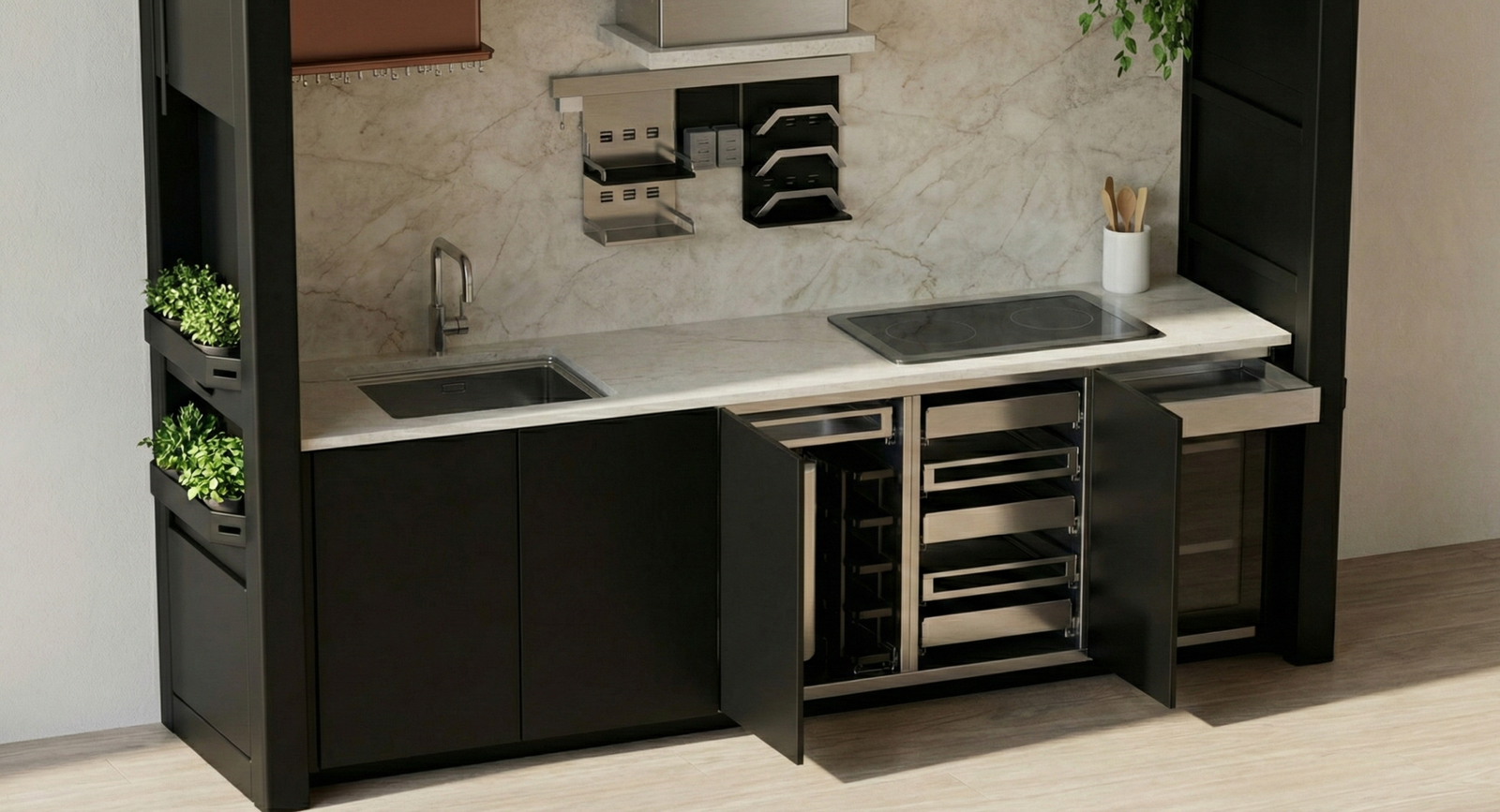 Mutfak gövdesinde tamamen kaybolan akıllı sürgülü sistem.