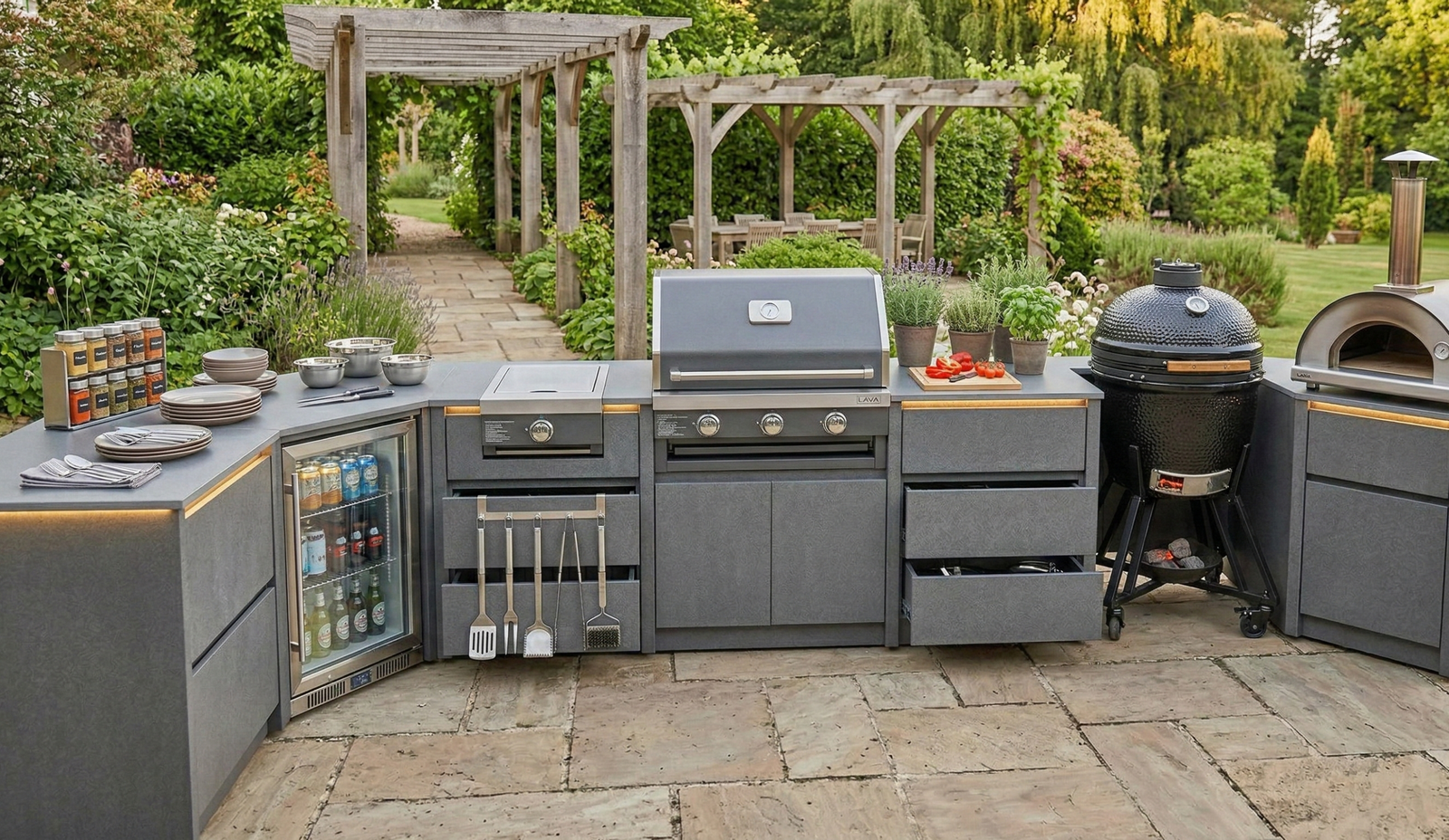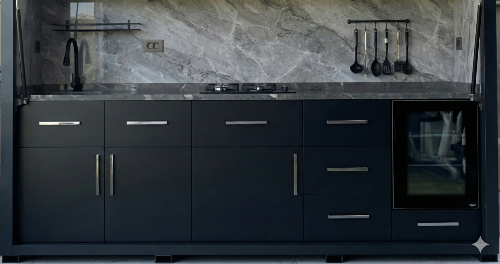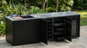 Kapak ve mekanizma kısıtlamalarını ortadan kaldıran açık sistem tasarımı, her an kullanıma hazır yapısıyla profesyonel bir bahçe mutfağı konforunu evinize taşır. Tüm hava koşullarına dayanıklı, uzun ömürlü metal mutfak gövdesi sayesinde, dış mekanda şık ve dayanıklı bir şef alanı oluşturur.