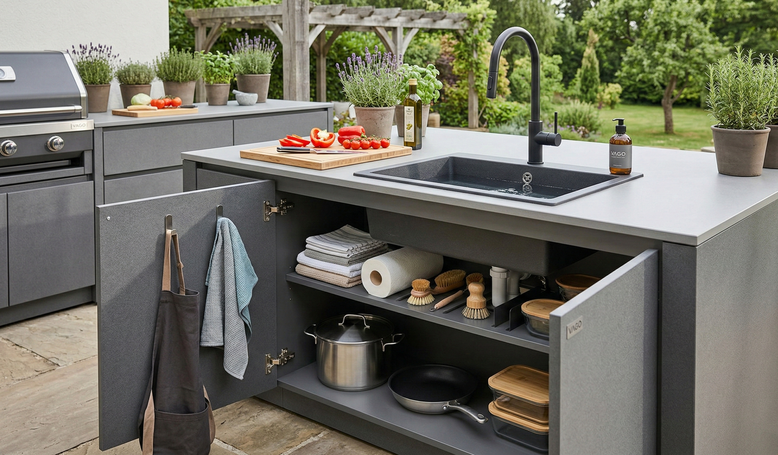 Açık sistemin en büyük avantajı, ihtiyacınız olan her şeye saniyeler içinde ulaşabilmenizdir. Bahçe mutfağı ekipmanlarınız için geniş ve havadar bir depolama alanı sunan bu tasarım, pişirme esnasında size tam hareket özgürlüğü sağlar. Modüler yapısı sayesinde Vago Pro-Kit aksesuarlarıyla kolayca zenginleştirilebilir.
